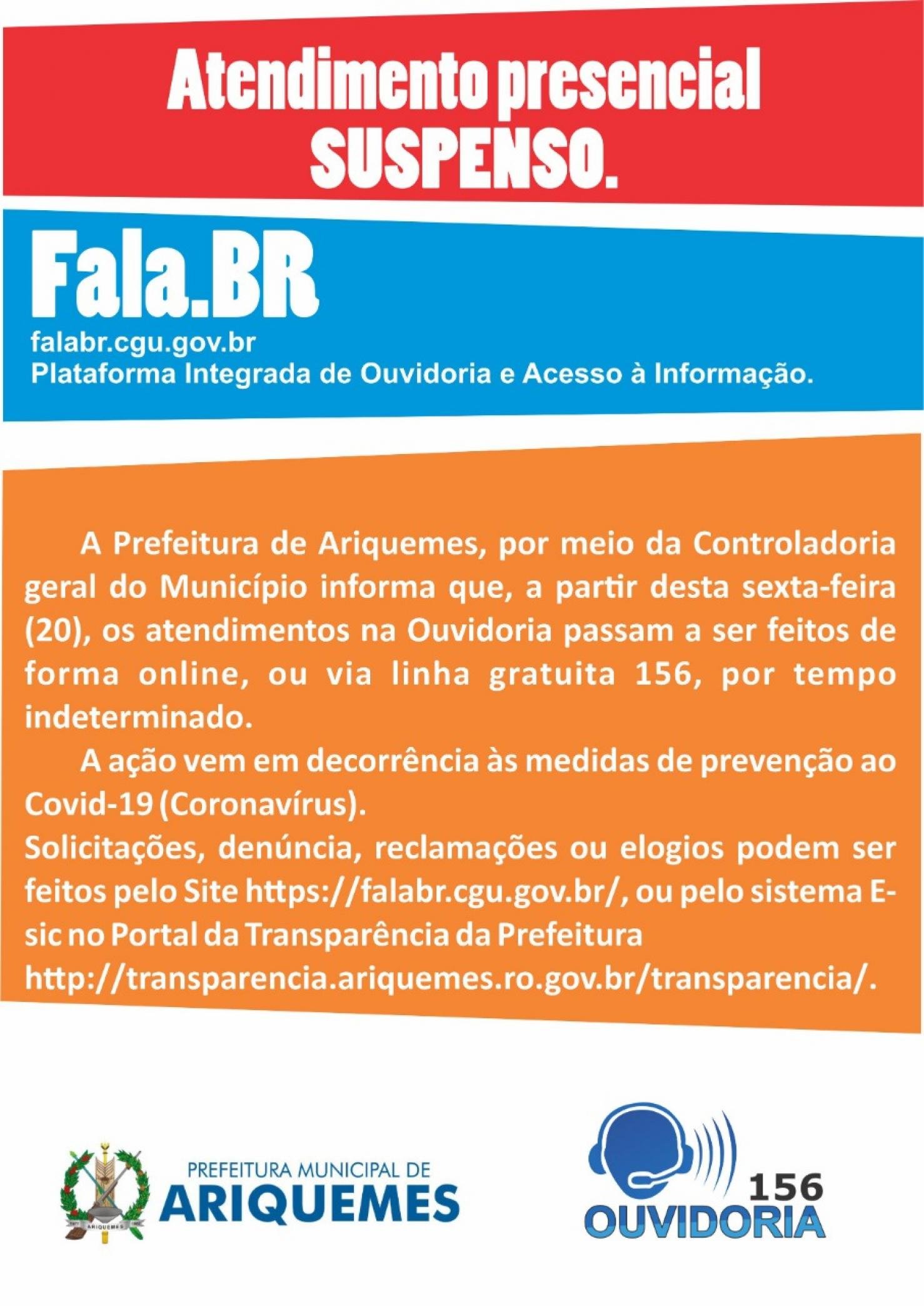 A Prefeitura de Ariquemes, por meio da Controladoria geral do Município informa que, a partir desta sexta-feira (20), os atendimentos na Ouvidoria passam a ser feitos de forma online, ou via linha gratuita 156, por tempo indeterminado.