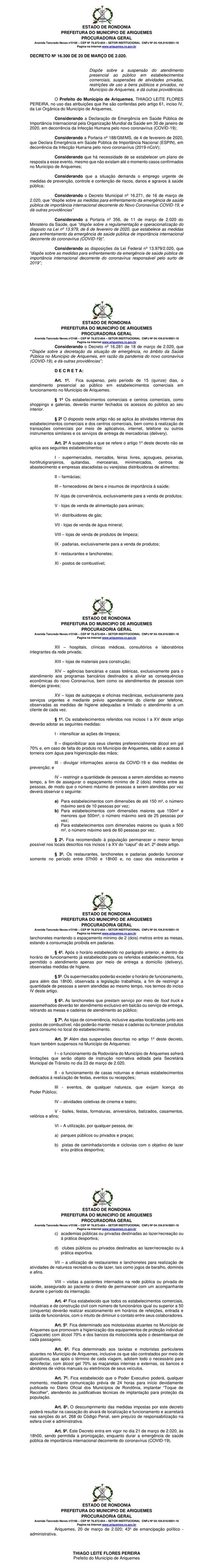 ARIQUEMES: Confira na íntegra o Decreto Municipal que suspendeu o atendimento presencial no comércio local