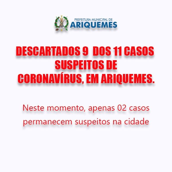 Segundo o secretário municipal de Saúde, Marcelo Graeff, os resultados dos exames dos 09 casos descartados deram negativo para o COVID-19." Dos 11 casos de Ariquemes, 09foram descartados, inclusive os primeiros. Temos apenas dois casos suspeitos e nenhum confirmado na cidade." Explicou.