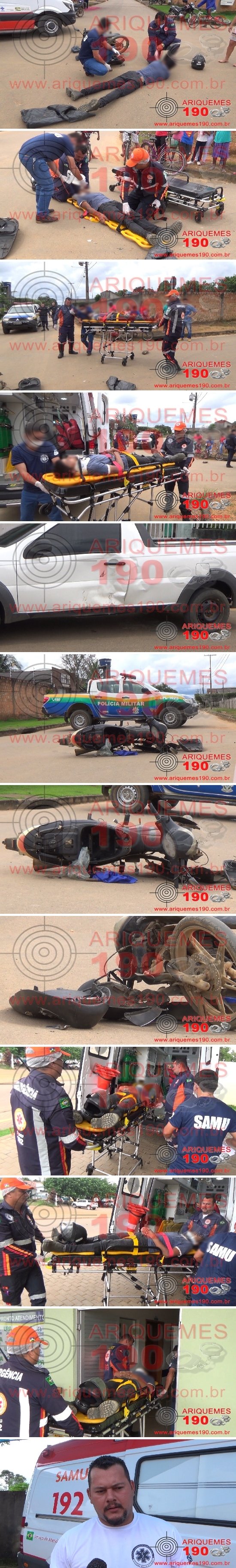 Mais um acidente de trânsito foi registrado na cidade de Ariquemes, e pelas imagens captadas pelas câmeras da equipe de reportagens do Site Ariquemes190 e Canal 35, a vítima contou com sorte para sair com poucos danos. O fato ocorreu quando a Central do Serviço de Atendimento Móvel de Urgência (SAMU) foi acionada a comparecer no Bairro Rota do Sol em Ariquemes, em um cruzamento, pois segundo informações teria ocorrido um acidente de trânsito com vítima no local. Imediatamente os socorristas se deslocaram até o referido endereço, onde ali chegando puderam constatar a veracidade das informações, encontrando a vítima, um rapaz, o qual se queixava de dores na coluna. De imediato os socorristas iniciaram os procedimentos de primeiros socorros, prancheando e imobilizado a vítima, onde posteriormente o rapaz foi conduzido até a Unidade de Pronto Atendimento (UPA) para que recebesse os procedimentos médicos necessários. A equipe da Polícia Militar, que se fez presente no local, em contato com o condutor do veículo Fiat/Strada, este informou que trafegava na via, momento em que houve a colisão com a motoneta Sundown/Web. As informações foram coletadas para registro do Boletim de Ocorrência Policial.