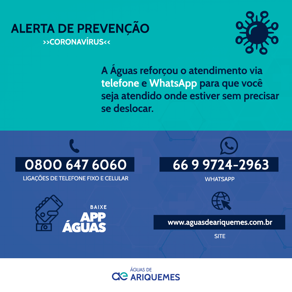 A Águas de Ariquemes, buscando proporcionar ainda mais segurança e bem-estar aos clientes, seguindo orientações dos órgãos de saúde pública para conter o avanço do coronavírus, ampliou os canais de atendimento e serviços online para que o morador não tenha a necessidade de ir até a Loja de Atendimento presencial para ser atendido. A medida atende a uma das recomendações de combate ao novo vírus: evitar ambientes com aglomerações de pessoas, uma vez que é facilmente transmissível.