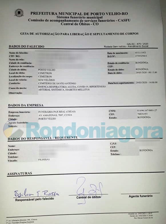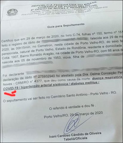 Uma idosa de 66 anos morreu neste sábado (29) em Porto Velho infectada por Coronavírus, segundo atestou a médica Delma Conceição Pereira das Neves em guia para sepultamento assinado pela tabeliã do 4º ofício de notas, Ivani Cardoso Cândido de Oliveira. A idosa, segundo o documento morreu por “doença respiratória Covid 19/hipertensão arterial sistêmica/ diabetes mellitus”.