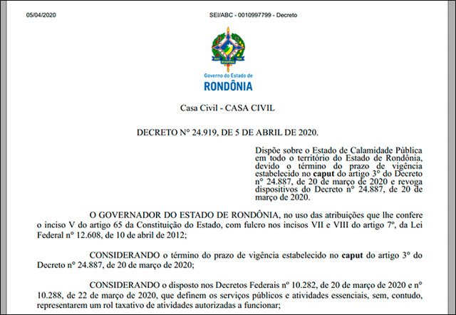 O governador Marcos Rocha assinou na madrugada deste domingo (5) um novo decreto ampliando a quarentena em Rondônia por conta do Coronavírus até o próximo dia 20 de abril. Ele flexibilizou várias proibições, contidas em decreto anterior (24.887), dando poderes aos municípios, para decidirem, a partir de 12 de abril, sobre o retorno gradual de uma série de atividades, desde que as decisões sejam fundamentadas e "que não haja elevação significativa dos casos confirmados de COVID-19". Há ainda mudanças com relação a atividade de mototáxi, que poderão funcionar, desde que autorizada pelos prefeitos.