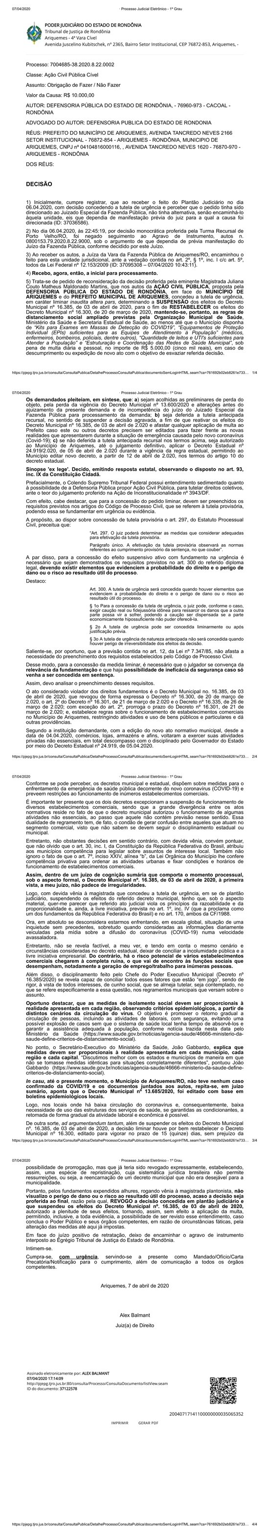 O Juiz da 4° Vara Cível da Comarca de Ariquemes, Dr. Alex Balmant, REVOGOU na tarde desta terça-feira, 07/04, a decisão concedida em plantão judiciário, que suspendeu os efeitos do Decreto Municipal nº. 16.385, de 03 de abril de 2020, pedindo ainda que cumpra-se em caráter de urgência sua decisão. Confira na íntegra o documento:
