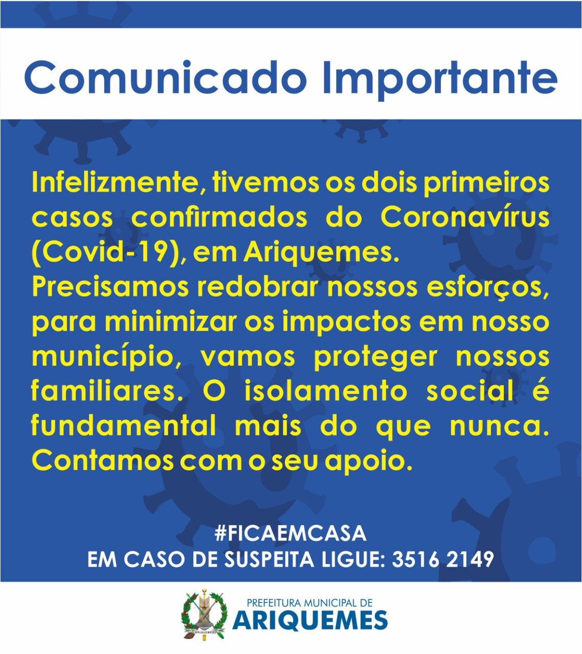 ?? A Prefeitura de Ariquemes, através da Secretaria Municipal de Saúde (SEMSAU), confirmou nesta sexta-feira (10), os dois primeiros casos de Coronavírus (Covid-19), em pacientes do município.