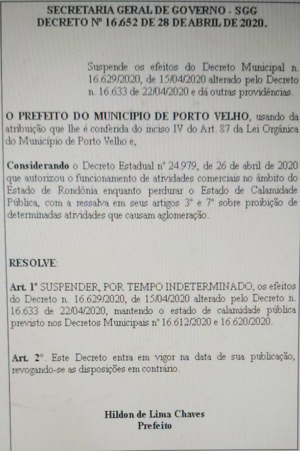 Após liberar a reabertura de grande parte do comércio em Porto Velho (RO) desde a última segunda-feira (27), o prefeito Hildon Chaves (PSDB), sob pressão do Ministério Público do Estado de Rondônia – MP/RO revogou a sua própria determinação e fechará novamente os pontos comerciais por conta da pandemia de COVID-19.