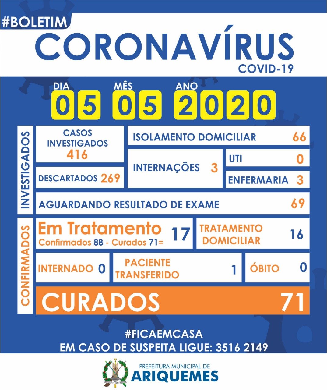 Ariquemes: Covid-19 - Dos 88 casos confirmados, 71 pacientes já estão curados, o que representa 80,6% dos casos.
