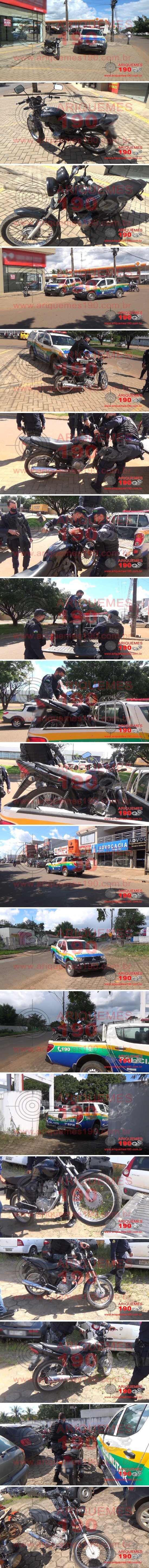 Narra o Boletim de Ocorrência Policial registrado sob n° 67.153/2020, que por volta das 13h50m desta terça-feira, 05/05, a guarnição da Polícia Militar composta pelos policiais Sgt. Cleilton, CB Ideam e SD Marcos Santos, foi acionada via Central de Operações a se deslocar à Rua Vitória, Setor 3 em Ariquemes, pois no local teria ocorrido um crime de furto. Ali chegando, os policiais fizeram contato com a vítima, a qual informou que fazia uns quarenta minutos que havia chegado em sua residência para tomar banho e retornar ao serviço, quando ao sair no portão percebeu que sua motocicleta, uma Honda/CG Fan 125 de cor preta com placa de Ariquemes/RO, que estava do lado de fora tinha sido furtada. Após coleta de informações e estas serem repassadas para a Central, a patrulha Bravo, composta pelos policiais: CB Portel, SD Zeri e SD Gomes, se deparou com o veículo estacionado na Avenida JK, próximo ao um posto de combustíveis e ninguém próximo. Segundo informações coletadas no local pela equipe de reportagens do site Ariquemes190 e Canal 35.1 Digital, o veículo estava sem combustível. Mediante a constatação o veículo foi conduzido até a Unidade de Segurança Pública (UNISP) e apresentada à autoridade policial, para tomada de providências necessárias.