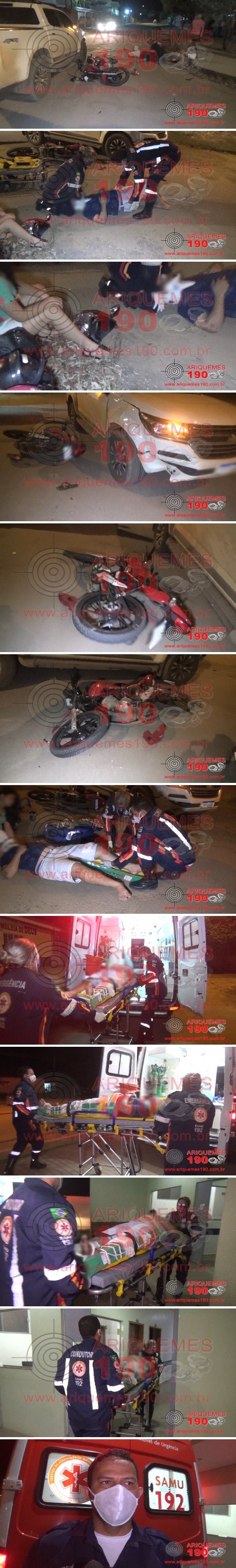 Era por volta das 21h35m dessa segunda-feira, 25/05, quando a Central do Serviço de Atendimento Móvel de Urgência (SAMU) e Polícia Militar foram acionadas a comparecer na Rua Inglaterra com Finlândia, Bairro Jardim Europa em Ariquemes, para averiguar um acidente de trânsito entre moto e camionete, onde uma vítima estaria ferida. Rapidamente policiais e socorristas se deslocaram ao endereço indicado, onde ali chegando já puderam constatar a veracidade da informação, encontrando um homem (o motociclista) caído ao solo, apresentando uma lesão fechada em membro inferior esquerdo, sugerindo uma fratura. Imediatamente os socorristas iniciaram os procedimentos pré-hospitalares à vítima, imobilizando o membro com talas flexíveis e ataduras, a vítima em prancha rígida com colar cervical e red block, em seguida sendo o rapaz conduzido à Unidade de Pronto Atendimento (UPA) para ser avaliado pela equipe médica de plantão e realização de exames especializados para confirmação da lesão. A passageira que estava com o motociclista e o condutor da camionete, nada sofreram, além do susto e dispensaram o atendimento de socorro. No local os policiais foram informados por populares, que o condutor da caminhonete Chevrolet/S10 de cor branca transitava pela Rua Finlândia sentido Avenida Tancredo Neves, quando no cruzamento com a Rua Inglaterra houve a colisão transversal com a motocicleta Honda/CG 160 Fan de cor vermelha, que seguia na Rua Inglaterra da AV. Machadino para Hugo Frey. Após a coleta de informações os policiais realizaram o registro do Boletim de Ocorrência Policial, para posterior tomada de providências necessárias.