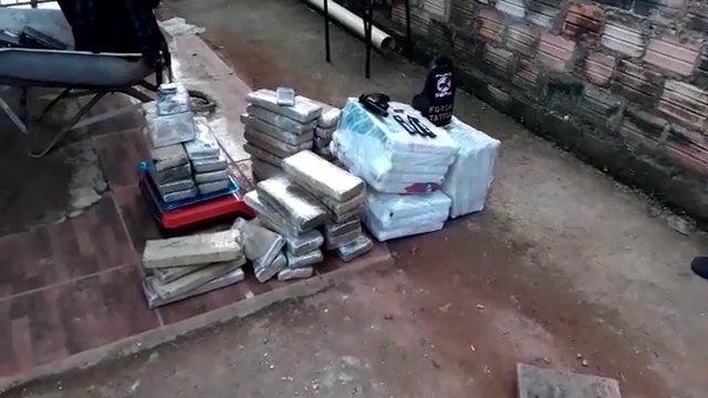 Com uma enxada, os militares começaram a cavar e encontraram vários tabletes de maconha enterrados, totalizando 64 kg. Cães farejadores auxiliaram nas buscas.