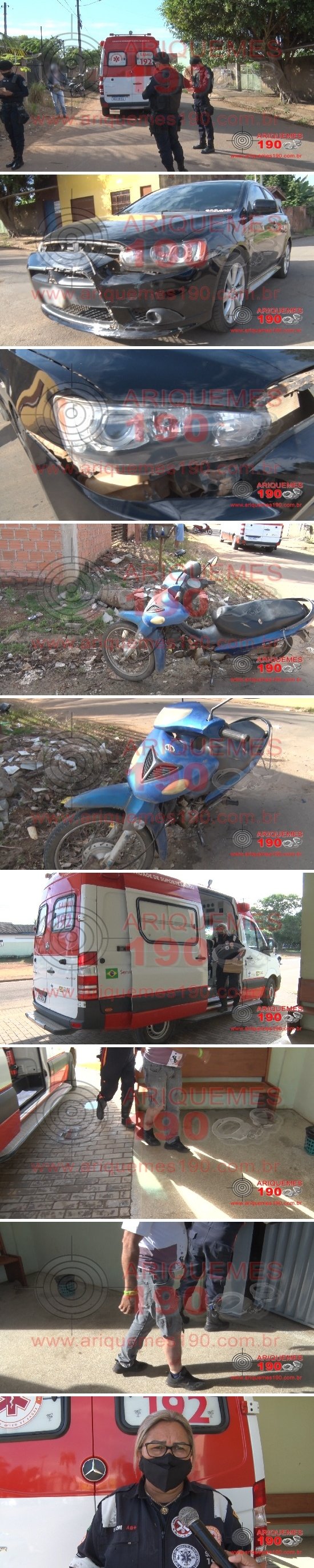 O fato ocorreu na Rua Paranavai, Setor 9 em Ariquemes, onde as Centrais da Polícia Militar e Serviço de Atendimento Móvel de Urgência (SAMU) foram acionadas a comparecer no local, pois teria ocorrido um acidente de trânsito entre carro e moto e um idoso estaria ferido. Rapidamente os socorristas chegaram ao endereço, onde já se depararam com o idoso sentado na lateral da via, consciente, orientado, verbalizando, e apresentando algumas escoriações pelo corpo, principalmente em membro inferior direito, na região do joelho. A vítima entrou na Unidade de Resgate deambulando, onde após a realização dos procedimentos pré-hospitalares, foi encaminhada à Unidade de Pronto Atendimento (UPA) para ser avaliada pela equipe médica de plantão. No local os policiais foram informados por populares que a condutora do veículo Mitsubishi/Lancer de cor preto, a qual permaneceu no local até que fossem finalizados todos os trabalhos, transitava pela Rua Araras e, ao transpor o cruzamento das vias, houve a colisão com o condutor da motoneta Sundown/Web de cor azul, que trafegava no sentido da Avenida Tucanos para a Araras. Após a realização dos trabalhos de praxe foi registrado o Boletim de Ocorrência Policial sob n° 80.388/2020, para a posterior tomada de providências necessárias.