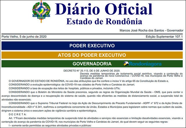 Embora prefira chamar de outro nome, as novas medidas tomadas pelo governador Marcos Rocha como enfrentamento ao Coronavírus podem sim ser considerados como lockdown. O decreto 25.113, publicado nas primeiras horas deste sábado, veda a circulação de pessoas em transporte público e privado nas cidades de Porto Velho e Candeias do Jamari, restringindo o trânsito nas entradas das duas cidades, permitindo apenas a passagem de profissionais da saúde e segurança, caminhões e residentes retornando para essas localidades. Há novas punições para quem desrespeitar as regras.