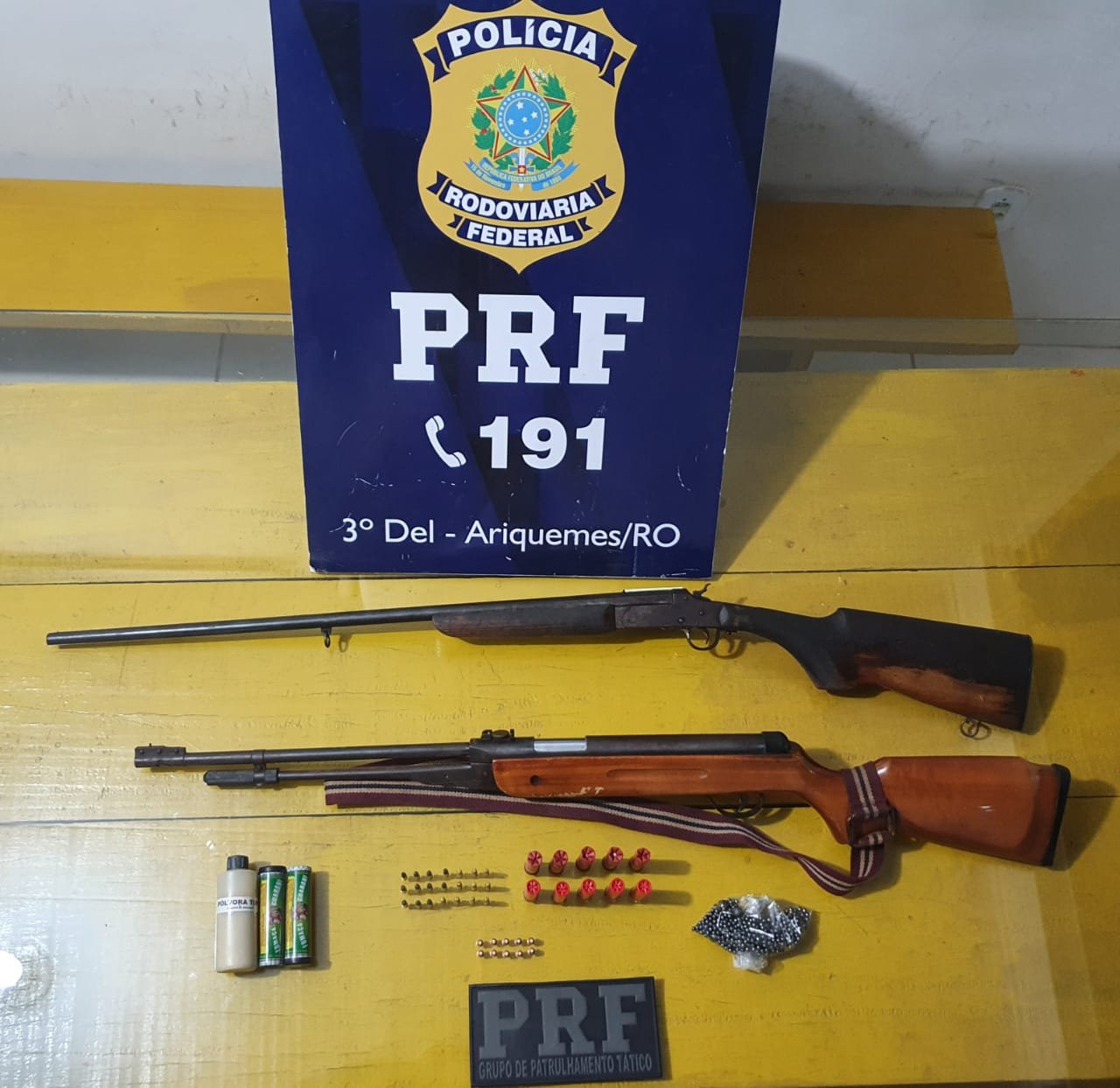 Na tarde dessa terça-feira, 09/06, por volta das 15h40m, uma equipe da Polícia Rodoviária Federal (PRF) compareceu no km 10 da BR-421, cruzamento com Travessão B-40, com o intuito de realizar abordagens de rotina, momento em que se deparou com a motocicleta Dafra/Riva 150, cor vermelha com placa de Ariquemes/RO, sendo o condutor identificado como sento T.S.R., e passageiro como L.R.S.S. O condutor mostrou nervosismo ao se deparar com a viatura policial, frenando a moto bruscamente, o que motivou a abordagem para averiguação. Em revista pessoal aos suspeitos, foi localizada junto aos abordados 5 munições CBC de calibre .22 e 5 munições CBC de calibre .28 em seus pertences. Questionados sobre o porquê de estarem com as munições, os suspeitos informaram que as munições eram de sua propriedade e confirmaram que possuíam uma arma artesanal de calibre .22 e uma espingarda de calibre .28 que estavam em suas residências. Mediante a confirmação os patrulheiros realizaram deslocamento até as residências dos infratores, onde foi franqueada a entrada da equipe policial, sendo que no quarto de T.S.R. foi encontrada a espingarda artesanal, sem marca ou numeração, de calibre. 22 e mais 16 munições CBC calibre .22. Em ato continuo os PRFs se dirigiram para a residência de L.R.S.S., onde a entrada foi franqueada, sendo que no local foi encontrada a espingarda sem marca ou numeração, de calibre .28, e 5 munições recarregadas calibre.28, 10 espoletas usadas para fabricação de munição de espingarda, 500 gramas de chumbo esféricos e 180 gramas de pólvora. Sendo constatado o ilícito, tendo em vista ambos infratores não possuírem o porte, todo o material foi apreendido, recolhido e apresentado na Unidade de Segurança Pública (UNISP), onde foi realizado o registro do Boletim de Ocorrência Policial para a tomada de providências a qual a autoridade policial julgar pertinente.