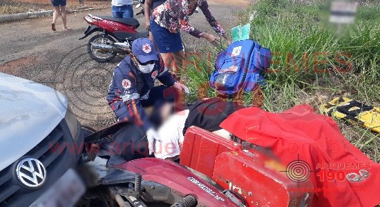 O acidente ocorreu na Rua 40 com a Rua 04, Bairro Zona Sul em Ariquemes, local onde as Centrais do Serviço de Atendimento Móvel de Urgência (SAMU) e Polícia Militar receberam o chamado a se deslocarem para o local para prestar apoio, pois a vítima estaria caída ao solo e sentindo fortes dores. Rapidamente policiais e socorristas se deslocaram ao endereço solicitado, onde ali chegando encontraram a vítima (que estava realizando entrega de alimentos) caída ao solo, a qual estava com seu corpo confinado entre o veículo, a moto e o meio fio da via. Rapidamente foram iniciados os trabalhos pré-hospitalares à vítima, que apresentava possível fratura de clavícula e fortes dores nessa região, sugerindo a possibilidade de fratura há mais algum membro. Após os primeiros procedimentos, com imobilização do membro fazendo uso de tala e ataduras, os socorristas lograram êxito em remover a vítima do local de confinamento, com apoio de populares que estavam no local e o auxílio do (J9) da Unidade de Suporte Avançado (USA), sendo imobilizada em prancha rígida e posteriormente conduzida à Unidade de Pronto Atendimento (UPA) para avaliação com a equipe médica de plantão. Aos policiais o condutor do veiculo VW/Gol 1.0 de cor prata com placas de Ariquemes/RO, relatou que transitava pela Rua 40 (sentido Av. Brasil), quando próximo ao numeral 1196, foi realizar uma manobra de ultrapassagem pelo veículo motoneta Honda/Biz 125 ES de cor vermelha, também com placa de Ariquemes/RO, no mesmo instante em que este foi realizar uma manobra a esquerda (para adentrar na Rua 04), momento em que houve a colisão na traseira da motoneta. O condutor do Gol ainda realizou a frenagem de seu veículo, onde as marcas sob a pista ficaram visíveis por aproximadamente 10 mt, mesmo assim a colisão foi inevitável. Após a coleta de informações os policiais realizaram o registro do Boletim de Ocorrência Policial sob n° 86.001/2020, para posterior tomada de providências necessárias.