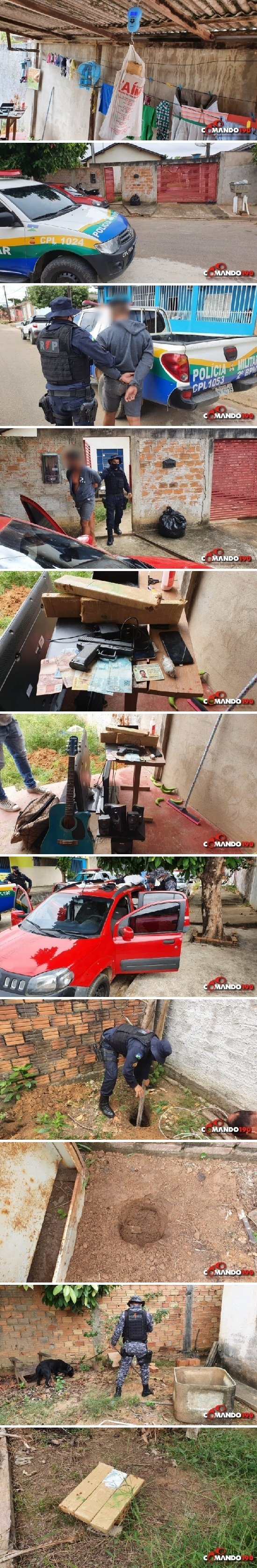 Dando continuidade a ocorrência e após buscas na residência de William, os policiais encontraram diversos objetos de procedência duvidosa, R$ 287 reais em dinheiro, um simulacro de pistola, uma balança digital e 03 tabletes de maconha enterrados no quintal.
