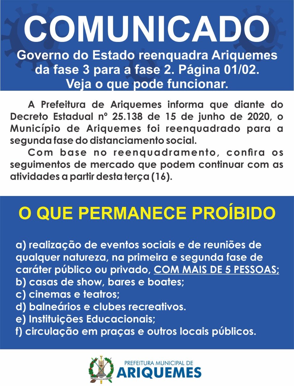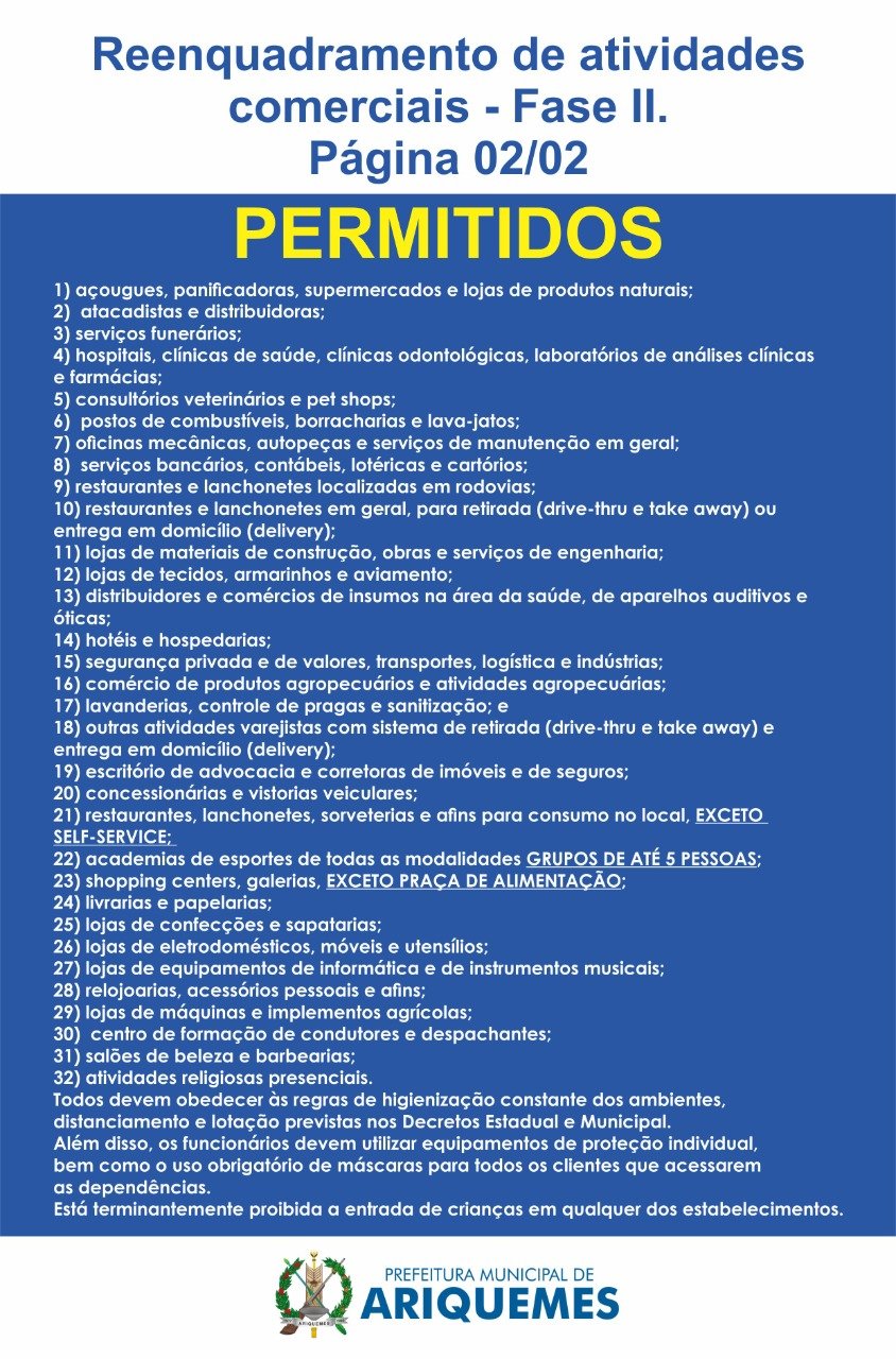 ARIQUEMES: Reenquadramento - Confira o que pode e o que não pode funcionar na Fase 02 do distanciamento social