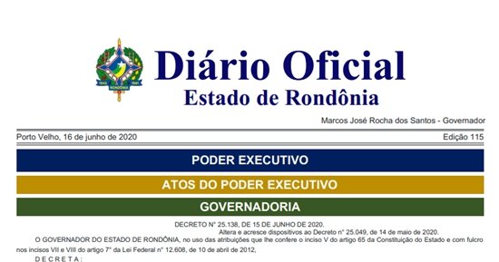 O Governo do Estado de Rondônia publicou na data de hoje, 16/06, o Decreto N° 25.138, onde define protocolos mais rigorosos para a retomada da economia do Estado de Rondônia e readequou as classificações de fases para os municípios. Conforme o novo Decreto, Ariquemes regrediu para a fase II, alterando o funcionamento do comércio local. Confira na íntegra o novo Decreto.