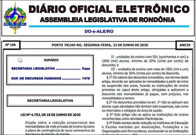 O Diário Oficial da Assembleia Legislativa de Rondônia promulgou nesta segunda-feira (22) a Lei 4.793, apresentada pelo deputado estadual Alex Silva (Republicanos), que define a redução proporcional das mensalidades de escolas e faculdades da rede privada de ensino durante o estado de calamidade pública pelo Coronavírus. O valor da redução oscila entre 10% a até 30%. A norma foi promulgada pela Casa de Leis em razão do silêncio do governador.