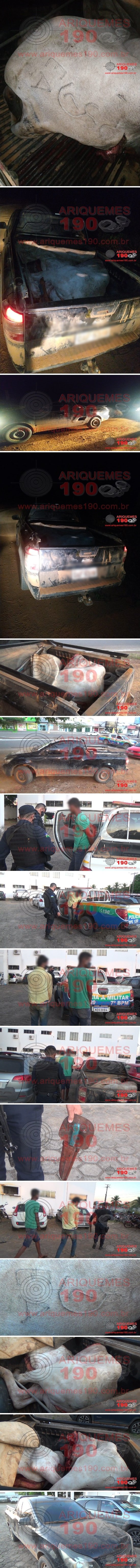 A Polícia Militar do Garimpo Bom Futuro agiu rápido ao receber informações e prender elementos que tinham acabado de invadir uma propriedade e abater um animal na Linha C-65, área rural de Ariquemes. Na informação repassada à PM, dava conta que alguém teria ouvido disparo de arma de fogo e, minutos depois passou uma caminhonete com a carroceria aberta e duas pessoas em cima. A guarnição se deslocou para a localidade e já no TB-0, os policiais ficaram frente a frente com o veículo suspeito e realizaram a abordagem ao Chevrolet/Montana de cor preto com placas do município de Ji-Paraná. No veículo encontrava se os elementos A.D. e R.S., e ao olharem na carroceria encontraram uma vaca com a marca EA, já abatida, sem a cabeça e sem as vísceras. Ao questionarem os suspeitos sobre a procedência do animal morto, eles confessaram ter matado em uma propriedade próxima ao local da abordagem, e ao questionarem de quem seria o animal, os elementos afirmaram não saber, pois teriam entrado em uma propriedade desconhecida e abatido o animal, configurando a prática de Furto. Mediante as constatações os dois elementos foram conduzidos ao Quartel do Bom Futuro, onde os PMs conseguiram identificar o proprietário do animal, que reconheceu a marca. Ao serem questionados como teriam matado o bovino, os marginais afirmaram que utilizaram uma faca e negaram terem usado arma de fogo. Diante dos fatos os meliantes foram conduzidos a Unidade de Segurança Pública (UNISP) de Ariquemes, onde foi lavrado o registro do Boletim de Ocorrência Policial sob n° 91.971/2020, para tomada de providências cabíveis. Atuaram na ocorrência os policiais: PM Terêncio, PM R. Santos e PM Ruiz.