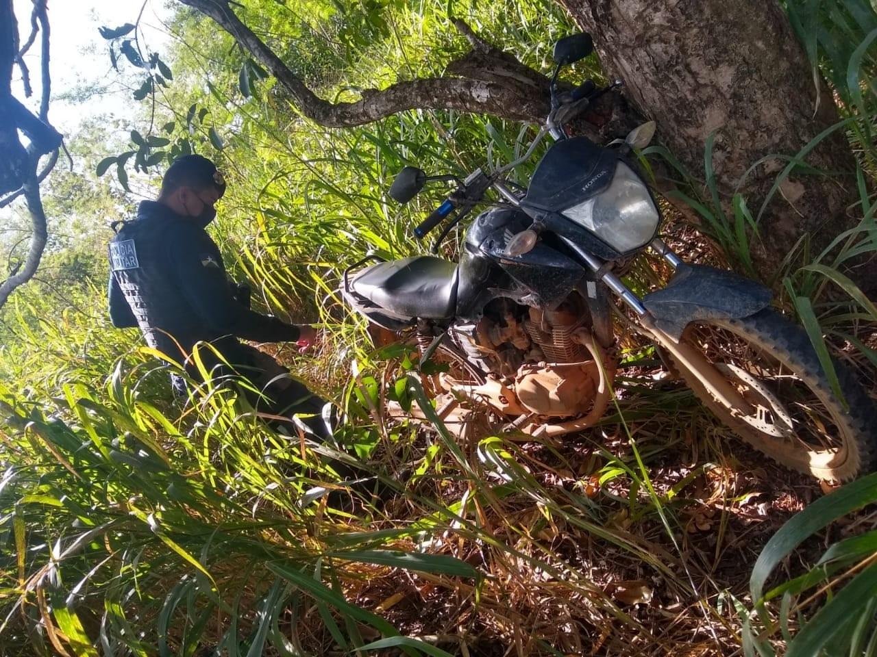Na tarde desta quinta-feira (26/06) policiais militares durante patrulhamento nas imediações da Vila Ebesa no Distrito Bom Futuro (Ariquemes) visualizaram um objeto em meio ao matagal, de imediato efetuaram a averiguação e se tratava de uma motocicleta CG FAN 150 ESDI de cor preta. O veículo não possuía placa, a consulta foi realizada por meio do número do chassi e constatado que havia restrição de roubo/furto. A motocicleta foi apresentada a delegacia do município de Alto Paraíso para demais providências.