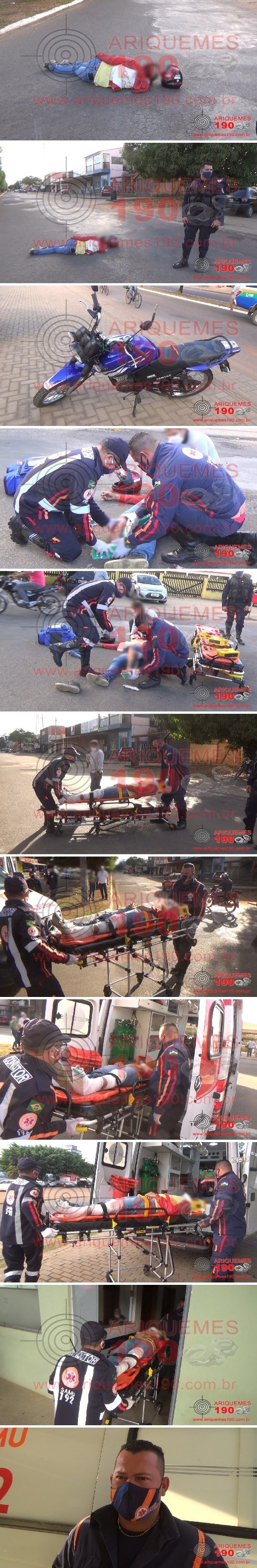 Por volta das 15h40m dessa quarta-feira, 01/07, as Centrais do Serviço de Atendimento Móvel de Urgência (SAMU) e Polícia Militar foram acionadas a encaminhar suas unidades à Avenida Canaã, Setor 02 em Ariquemes, pois no local teria ocorrido um acidente entre carro e moto e teria uma vítima ferida. Imediatamente policiais e socorristas se deslocaram ao local indicado, onde ali chegando puderam constatar a veracidade da informação, encontrando um homem caído ao solo no meio da via, o qual estava consciente, orientado, verbalizando, e apresentava uma lesão em membro inferior esquerdo, sugerindo uma fratura interna. Rapidamente os socorristas iniciaram os procedimentos pré-Hospitalares, sendo que, após imobilização do membro com tala e ataduras, da vítima em prancha rígida, com colar cervical e red block, a mesma foi encaminhada à Unidade de Pronto Atendimento (UPA) para ser avaliada pela equipe médica de plantão. Enquanto o SAMU prestava socorro à vítima, os policiais realizavam o controle do trânsito para evitar um novo sinistro. Ao coletar informações do que teria ocorrido, o condutor do automóvel Ford/Fiesta Sedan de cor prata com placas de Taio/SC, relatou aos policiais que transitava com seu veículo pela Avenida Canaã, quando de repente ouviu atrás do seu carro um estrondo como de uma colisão. O condutor parou o veículo para verificar o que teria acontecido, quando avistou o condutor da motocicleta Yamaha/Factor YBR125 de cor azul com placa de Ariquemes/RO, caído no chão, momento em que ligou pra o serviço de socorro (SAMU). Após coletar as informações os policiais realizaram o registro do Boletim de Ocorrência Policial sob n° 96.211/2020, para a posterior tomada de providência necessárias.