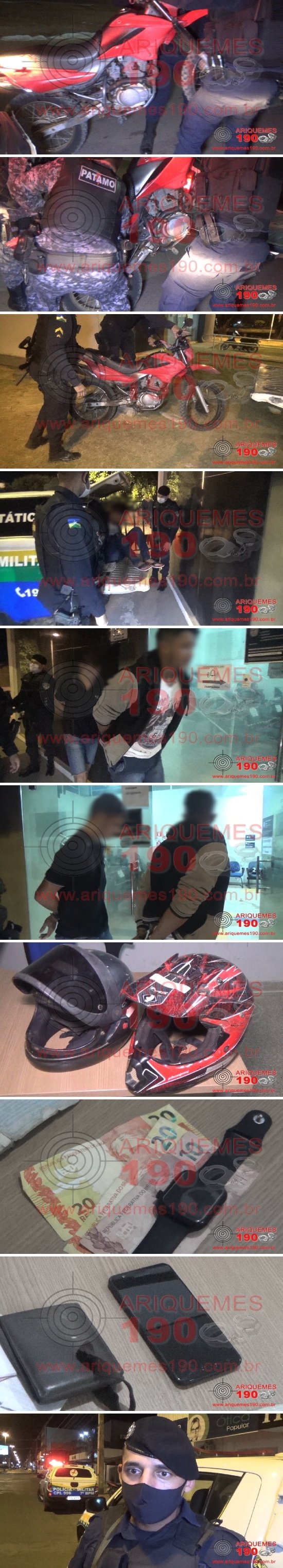 A ação rápida da PM que garantiu às vítimas parte de seus pertences recuperados ocorreu na noite dessa quarta-feira, 01/07 por volta das 21h17m, quando a guarnição da Polícia Militar foi acionada a se deslocar na Alameda Papoulas, Setor 4 em Ariquemes, onde teria ocorrido um crime de Roubo. Ali chegando, os policiais fizeram contato com as vítimas, as quais relataram que estavam seguindo pela 5° Rua do Setor 04, quando a certa distância visualizaram dois indivíduos em uma motocicleta Honda/NXR Bros, parados às margens da via, como se estivessem preparados para o cometimento do crime, sendo que ao perceberem as vítimas se aproximando, os agentes ligaram a motocicleta e se aproximaram com rapidez e, utilizando de violência e fazendo menção de estarem armados, tomaram da posse de uma das vítimas a quantia de R$ 40,00 reais em espécie e um aparelho smartphone Motorola modelo E5 de cor cinza. Da outra vítima os marginais subtraíram um relógio smartwatch modelo F5 de cor preto e logo em seguida tomaram rumo ao centro da cidade. Enquanto os policiais efetuavam o registro da ocorrência no local e ainda coletavam maiores informações das vítimas repassando na rede de rádio via Central de Operações para que as demais equipes em serviço pudesse se inteirar do ocorrido, outra guarnição já de posse das informações logrou êxito em localizar e efetuar a abordagem de dois agentes em frente ao Corpo de Bombeiros na Av. JK, com as mesmas características informadas dos marginais que teriam efetuado o Roubo. No momento da abordagem os agentes pilotavam a referida motocicleta informada pelas vítimas, sendo que, em posse de um deles estava o referido valor em espécie de R$ 40,00, subtraído da vítima, uma carteira porta cédulas, um pingente com símbolo de cifra, um celular de cor preto marca Samsung, modelo desconhecido e a quantia de R$ 10,00 em espécie que seria dele mesmo. Já com o outro elemento os policiais encontraram o relógio smartwatch pertencente à vítima, o qual foi reconhecido como sendo seu pertence subtraído no Roubo. O Aparelho celular da outra vítima já não estava mais com os elementos, somente o cartão de memória com fotos da vítima e, no celular do meliante havia um vídeo do celular da vítima, onde o mesmo oferecia o objeto para um receptador. Mediante todos os fatos e constatações os marginais, juntamente com o material recuperado foram apresentados na Unidade de Segurança Pública (UNISP), onde foi registrado o Boletim de Ocorrência Policial, para a tomada de providências necessárias.