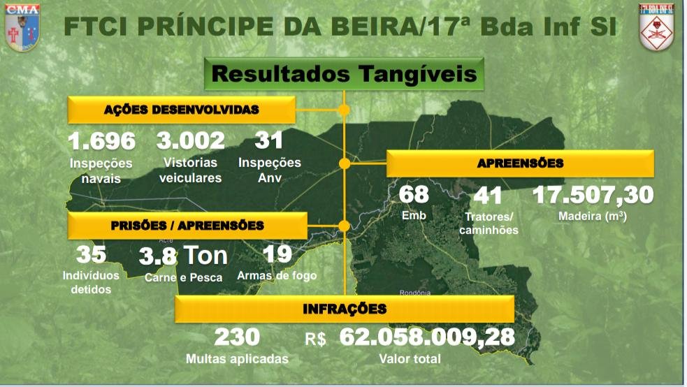 À frente do Comando Conjunto Príncipe da Beira, em Rondônia, o comandante da 17ª Brigada de Infantaria de Selva, general Luciano Batista de Lima, apresentou ao ministro, governador, e representantes de órgãos estaduais e federais que atuam conjuntamente na missão, os resultados da primeira fase da operação em Rondônia.