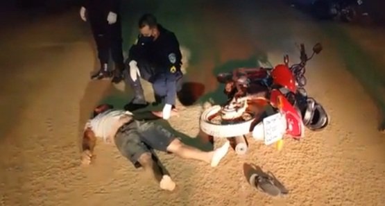 A Polícia Militar registrou na noite de sábado, 11, um grave acidente de trânsito que deixou bastante lesionado um homem de aproximadamente 35 anos de idade, após ele sofrer queda de uma motocicleta em alta velocidade, quando passava em um quebra-molas.