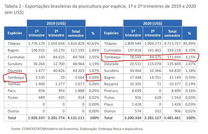 Elaborado em parceria com a Embrapa Pesca e Aquicultura, o estudo mostra que nos seis primeiros meses deste ano, a exportação do Tambaqui atingiu US$ 172.934,00, ficando atrás apenas das espécies Tilápia e Curimatá.