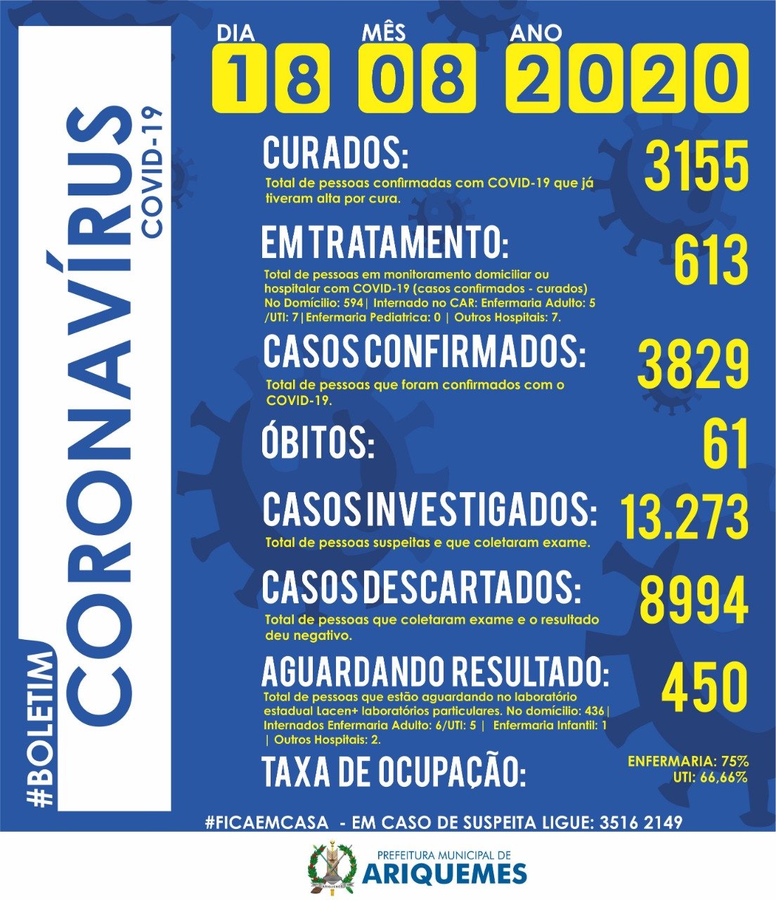 Com 12 internados na UTI, sendo 7 pacientes entre os casos confirmados e 5 pacientes entre os casos suspeitos, a taxa de ocupação é de 66,66%.