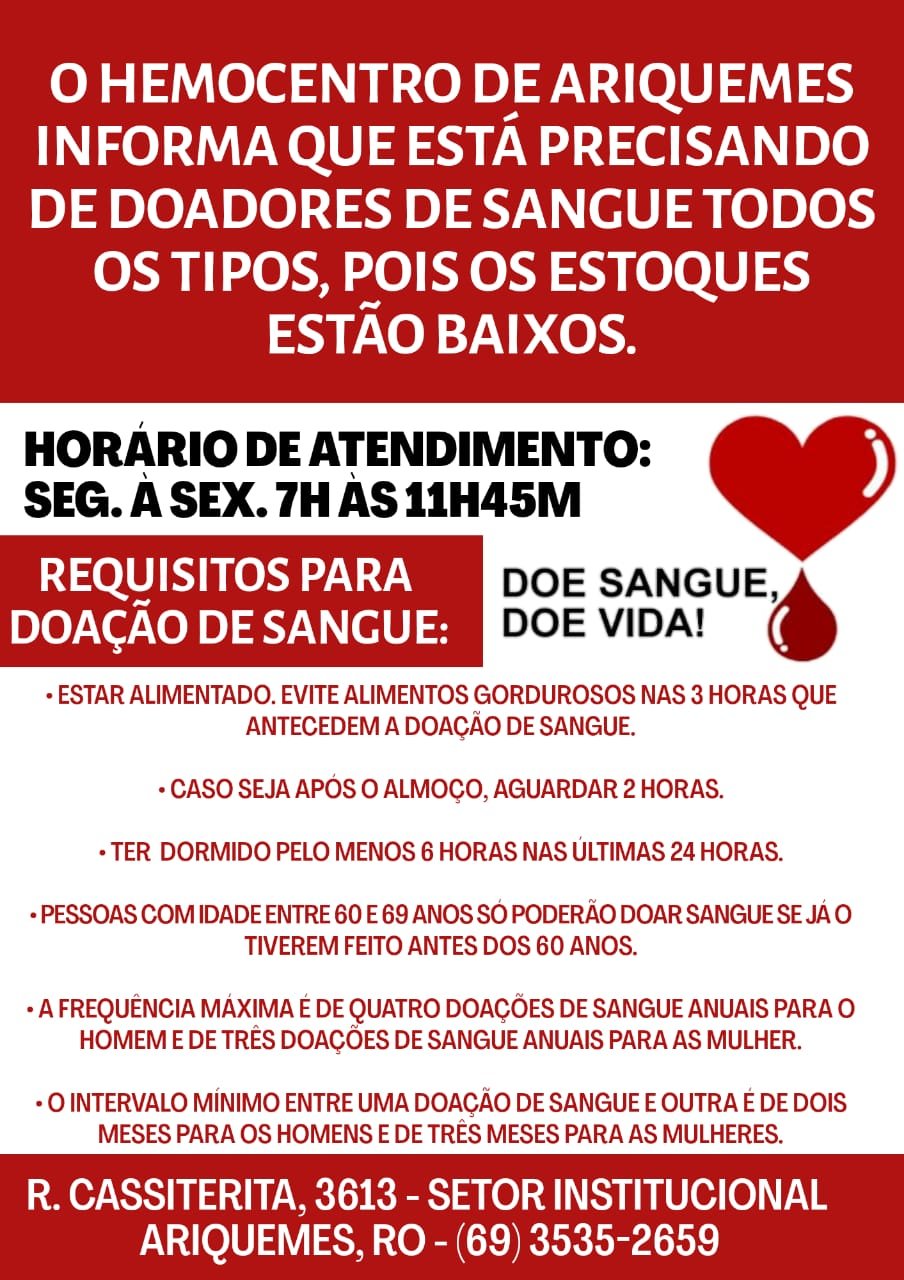 Com altas demandas, principalmente dos Hospitais de Base, do Amor e do Pronto Socorro João Paulo II, o estoque de bolsas de sangue fica em estado de alerta. Segundo a direção da Fundação de Hematologia e Hemoterapia da Rondônia (Fhemeron), todos os tipos sanguíneos estão em situação crítica e abaixo do ideal.
