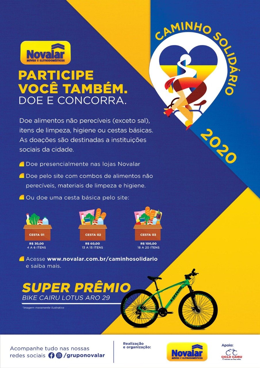 O Grupo Novalar realiza esse mês de Setembro o Caminho Solidário, que tem a finalidade de arrecadar alimentos e itens de higiene e limpeza para serem doados às instituições sociais de Ariquemes, e também incentivar a solidariedade e a responsabilidade social. O projeto acontece em substituição ao Passeio Ciclístico Solidário Novalar, que tradicionalmente era realizado nessa época todos os anos, e em 2020 não poderá ocorrer em decorrência da pandemia por Covid-19. Você pode realizar as suas doações levando-as diretamente nas lojas Novalar, em Ariquemes são 5 lojas, também pode doar de forma on-line, no site:https://www.novalar.com.br/caminhosolidario, solicitando a coleta em sua residência, basta preencher o formulário no próprio site, ou ainda, pode consultar um dos pontos de arrecadações mais próximo de você, e doar nas empresas parceiras. Quem realizar a doação estará concorrendo a uma super Bike Cairu Lotus Aro 29. Seja solidário, participe!