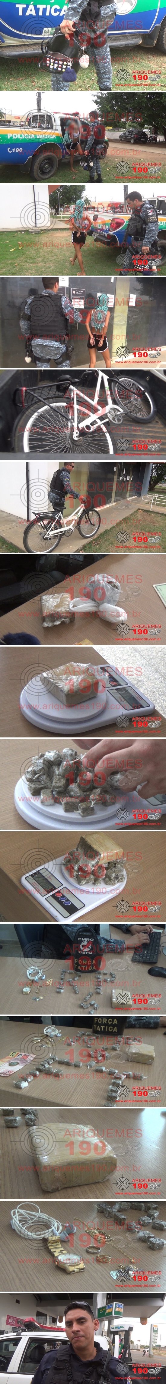 O fato ocorreu por volta das 15 horas do sábado, 26/09, quando os policiais da Patrulha Bravo realizavam patrulhamento pela Rua Osvaldo de Andrade, Setor 6 em Ariquemes, próximo à praça na Avenida Guaporé, momento em que perceberam a atitude suspeita de uma mulher com cabelo cor azul em uma bicicleta cor branca, a qual se evadiu do local ao avistar a guarnição, tomando rumo ignorado. Com apoio da Patrulha Charlie os policiais iniciaram as buscas próximo ao local, onde a suspeita foi vista na Avenida Guaporé, próximo a 9º Rua do Setor 06, momento em que a mesma tentou se evadir das guarnições, mas foi abordada. Ao realizar revista pessoal foram localizados na bolsa de cor preta que a mesma portava, um tablete e várias porções de substância aparentemente Maconha, totalizando 286 gramas de entorpecente, além de vários objetos de procedência duvidosa. Ao indagar a mesma sobre tais substâncias, esta informou que vendia e que sempre tinha apoio de uma amiga, e que ia vender o tablete por um mil e quinhentos reais (1.500,00) e cada porção enrolada no papel filme no valor de dez reais (10,00). Diante da situação a mulher foi conduzida juntamente com a substância entorpecente e vários objetos duvidosos à Unidade de Segurança Pública (UNISP), para a devida tomada de providências por parte da autoridade policial.
