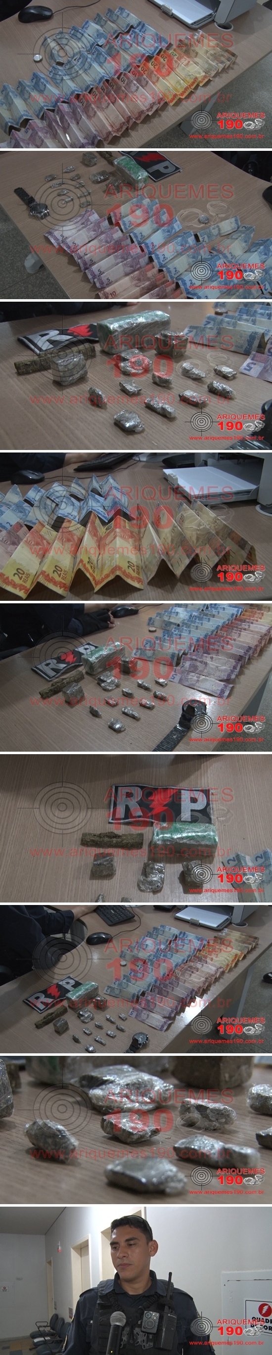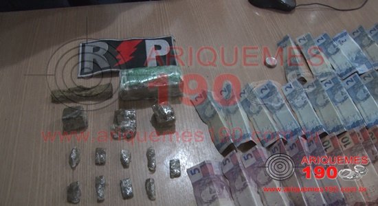 A guarnição da Patrulha Bravo, composta pelos PMs CB Ralilson, SD Werkhausen e SD Abrantes, intensificou o patrulhamento pela Rua Beija Flor, Setor 02 de Ariquemes, na proximidade da Praça do Açaí, onde os policiais foram informados que algumas pessoas estavam comercializando droga no local. Os PMs avistaram um elemento em atitude suspeita e decidiram realizar abordagem, o qual foi identificado como sendo T.L. Na revista pessoal foi encontrada a quantia de R$ 409,00 (quatrocentos e nove reais) em dinheiro e uma pequena quantidade de substância entorpecente aparentando ser Maconha. Os policiais indagaram o rapaz sobre a droga e o dinheiro, onde o mesmo confessou que teria vendido algumas parangas para um conhecido, vulgo Tom. Questionado se o mesmo teria parangas em sua casa, muito nervoso o meliante afirmou que não, mas autorizou os policias realizarem a revista. Ao chegarem na casa a mãe do rapaz recepcionou os PMs e autorizou a entrada dos mesmos, que iniciaram as busca na casa, sendo encontrado na lixeira da residência um pequeno tablete, e no quarto mais substâncias, todas aparentando ser Maconha, totalizando 258 gramas. Diante do flagarante delito de Tráfico de Drogas o elemento foi apresentado na Unidade de Segurança Pública (UNISP) para registro do Boletim de Ocorrência Policial e tomada de providências necessárias.