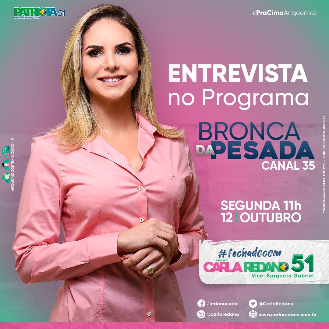 A candidata a Prefeita de Ariquemes, Carla Redano (Patriota) será a entrevistada no Programa Bronca da Pesada desta segunda-feira (12), que vai ao ar pelo Canal 35.1 a partir das 11 horas. A entrevista com Carla seria realizada na última sexta-feira, mas foi cancelada devido a candidata estar com suspeita de Covid-19, que já foi descartado após exames.