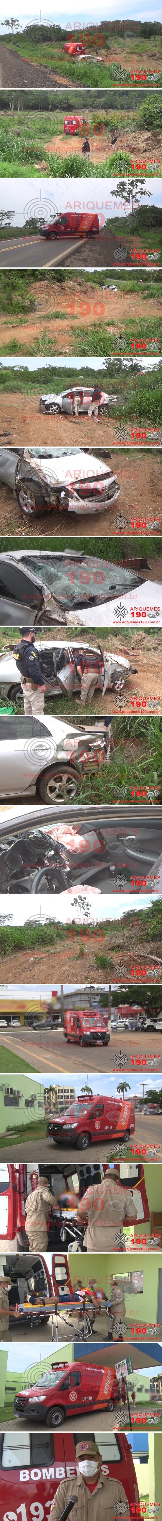 Na manhã desta sexta-feira, 23/10, por volta das 10h, as Centrais da Polícia Rodoviária Federal (PRF) e do Corpo de Bombeiros Militar do Estado de Rondônia (CBMRO) receberam o chamado para se deslocar na BR-364, Km-501, sentido Jaru em Ariquemes/RO, onde segundo informações teria ocorrido um capotamento. Com brevidade a equipe do Corpo de Bombeiros composta pelos socorristas: Sgt. Elton, CB Evair e BM Lailson, e os policiais foram até o local, onde ali chegando, se depararam com um homem que estava dentro do veículo, o qual apresentava escoriações pelo corpo. De pronto os socorristas iniciaram o atendimento de primeiros socorros à vítima, imobilizando em prancha rígida, com colar cervical e colete imobilizador dorsal, posteriormente esta sendo conduzida à Unidade de Pronto Atendimento (UPA), para ser avaliada pela equipe médica de plantão. Ao conceder entrevista à equipe de reportagens do Site Ariquemes190 e Canal 35.1 Digital, o Bombeiro Lailson relatou que a vítima verbalizava e que se queixava de dores na região da lombar e tórax. Informações passadas à equipe de reportagens, dão conta que o acidente aconteceu, quando o condutor do automóvel Toyota/Corolla, de cor prata com placas de Porto Velho/RO trafegava pela via, momento este que outro veículo o fechou, o qual para evitar a colisão, saiu da pista e passou por um desfiladeiro de aproximadamente 3 metros, o qual despencou e capotou diversas vezes. A vítima relatou que após o capotamento, saiu do Corolla para recolher objetos que estavam ao solo, contudo o mesmo sentiu dores na região da coluna e retornou para o veículo. O automóvel ficou com avarias em toda sua extensão.