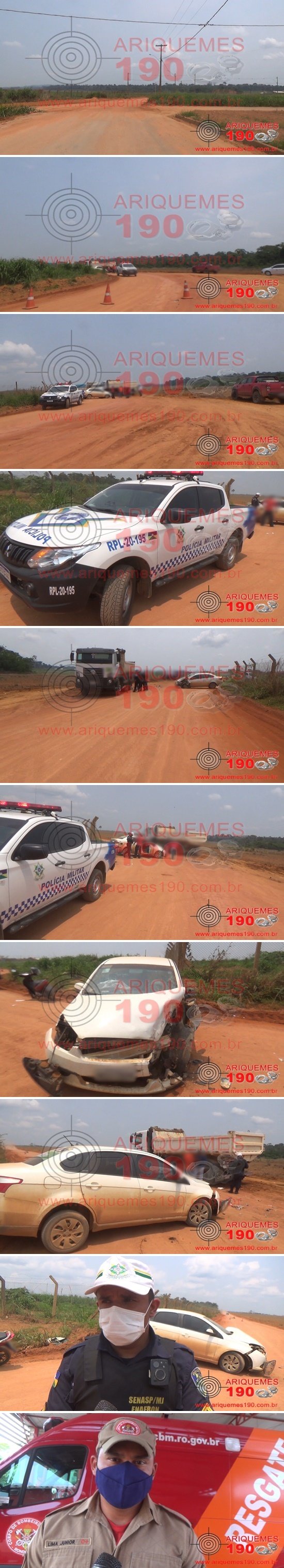 As Centrais de Operações da Polícia Militar e do Corpo de Bombeiros Militar do Estado de Rondônia (CBMRO), foram acionadas para se deslocarem no desvio da BR-364 em Ariquemes/RO, onde teria ocorrido um acidente entre carro e caminhão. Imediatamente a equipe do CBMRO composta pelos socorristas: Sgt. André, SD Purcino e CB Lima Junior, juntamente com a guarnição da Polícia Militar, composta pelos policiais: CB Cleiton Barbosa e SD Lúcio, foram até o local, onde constatou a veracidade da informação, onde visualizaram três vítimas que trafegavam em um automóvel. De pronto, foram realizados os procedimentos de primeiros socorros às vítimas, sendo estas encaminhadas à Unidade de Pronto Atendimento (UPA), para serem avaliadas pela equipe médica de plantão. Ao conceder entrevista à equipe de reportagens do Site Ariquemes190 e Canal 35.1 Digital, o BM CB Lima Junior relatou que as vítimas estavam conscientes, no qual uma idosa sentia fortes dores na região do tórax, sendo que a segunda vítima, uma mulher, obteve cortes em membro superior na região da mão esquerda e a terceira, uma criança de cinco anos, que sofreu cortes na região da face. Informações passadas à equipe de reportagens dão que, quando a condutora transitava em seu veículo Fiat/Siena, de cor branco com placas de Ariquemes/RO, pela BR-364, no que ao adentrar o desvio em sentido a cidade de Ariquemes/RO, houve a colisão com o caminhão VW/26.280, de cor branco com placas de Ariquemes/RO, que saía do desvio em sentido a BR-364. O Fiat ficou com avarias em sua parte frontal devido ao impacto.