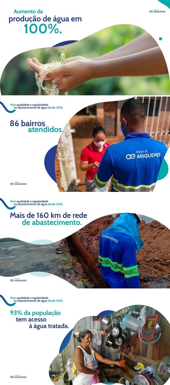 Em quatro anos de concessão, por exemplo, a empresa ampliou 165 km da rede de distribuição e aumentou 100% sua capacidade de produção com a obra e reforma da ETA - Rio Jamari. Agora, já são três Estações de Tratamento em operação, sete poços tubulares para a captação de água e quatro reservatórios com capacidade de armazenamento de 2.480 m³.
