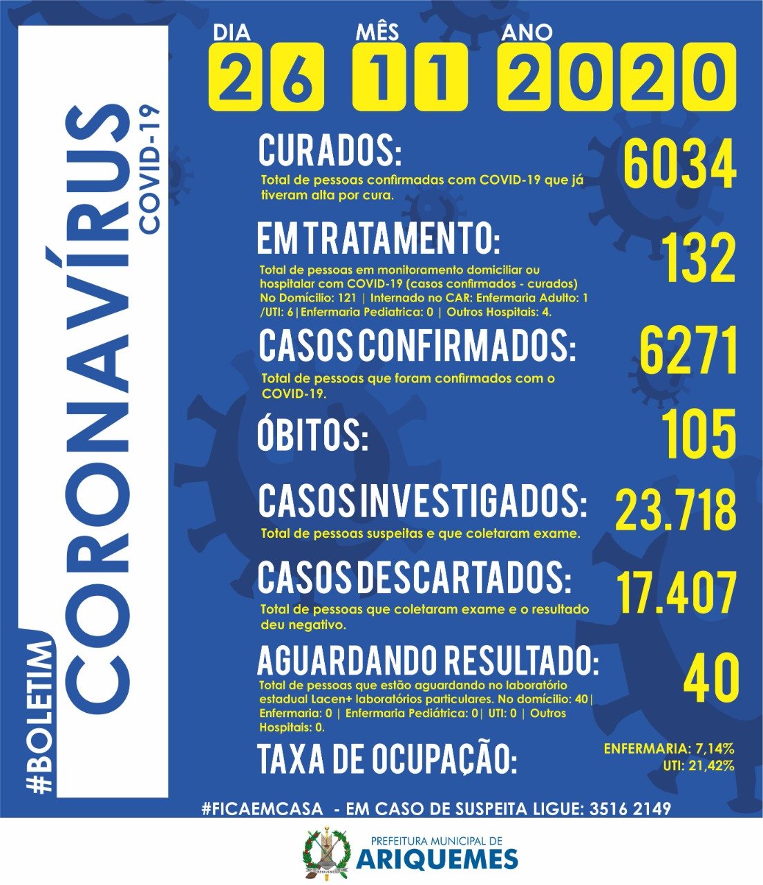 Nesta quinta-feira (26), foram registradas 9 altas médicas, com relação ao boletim do dia anterior, chegando a 6.034 pessoas curadas, o que equivale a 96,22% do total dos casos.