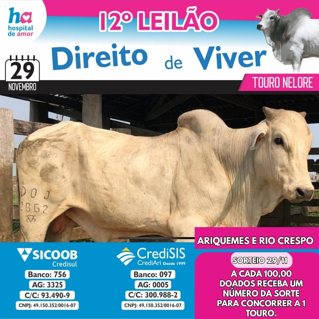 Neste domingo, (29/11) acontecerá a 12ª Edição do Leilão “Direito de Viver” no parque de exposição da Associação dos Pecuaristas de Ariquemes (APA), desta vez de forma virtual, e com a expectativa de superar arrecadação do ano passado. “Esse ano devemos superar o número de doações de gado para o leilão. Quero agradecer a todos que foram a campo na área rural, visitando os agricultores para chegarmos a essas doações. Quero agradecer também aos nossos produtores rurais que sempre ajudaram e aos nossos grandes colaboradores e parceiros”, afirmou Ojair Bortolamed. A responsabilidade de separar os lotes de gado para o sorteio fica a cargo do pecuarista Tião Jiboia, um grande parceiro das ações em prol do Hospital de Amor. Informações que esse trabalho já iniciou e Tião Jiboia estaria muito animado com o plantel doado para o leilão, pois são animais de ponta.