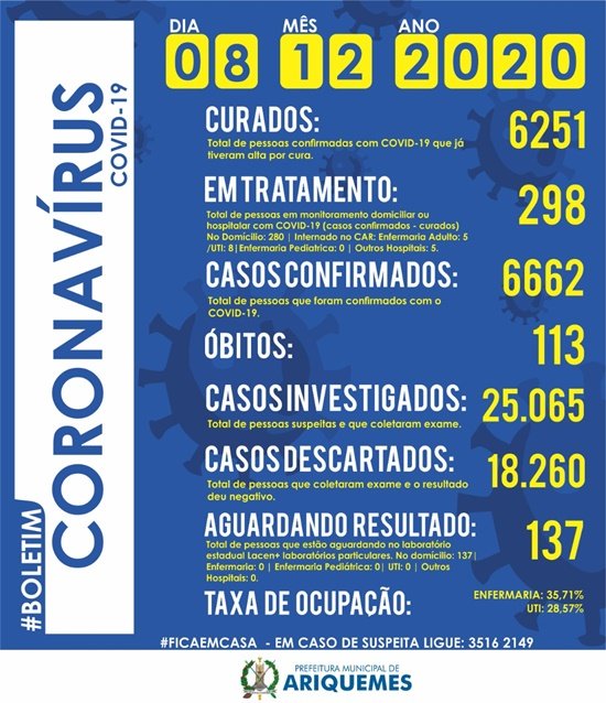Lamentavelmente o 113° óbito foi registrado nesta terça-feira. Trata-se de um homem de 72 anos, que possuía histórico de comorbidade e que estava internado no CAR.