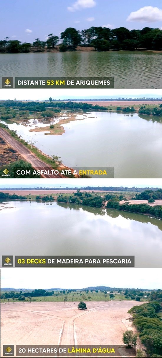 Agora chegou a hora de você investir na sua felicidade, no seu bem estar e de sua família! Já imaginou ter um lugar somente seu, onde você e sua família possam colecionar memórias preciosas e passar momentos de lazer inesquecíveis? Esse lugar existe! Chácaras Rey do Peixe, um empreendimento inovador, localizado a 53 Km de Ariquemes, sentido Porto Velho/RO, com asfalto até a entrada, 3 Decks de madeira para pescaria, 20 hectares de lâmina d´água, descedor para barcos, 5 quiosques e muito mais. Você adquire sua chácara com facilidade no pagamento, com 25% de entrada e o restante em 48 parcelas no boleto! Vendas na AD imóveis, Tel. 3536-7480 / 9 8445-2429.
