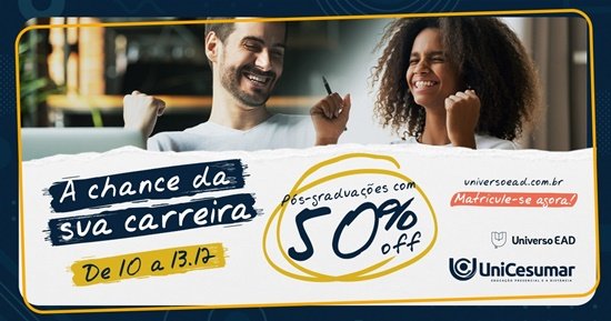 Nos dias 10 a 13/12, a Unicesumar, por meio da plataforma Universo EAD, disponibiliza mais de 90 cursos de pós-graduação com 50% de desconto. São cursos na área de Direito, Educação, Inovação e Criatividade, Design, Negócios, Saúde, Social, Tecnologia e Teologia.