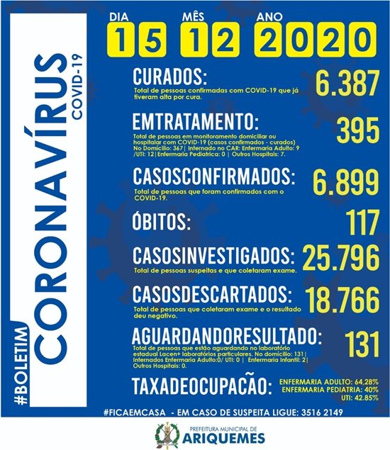 Nesta terça-feira (15), foram registradas 20 altas médicas, com relação ao boletim do dia anterior, chegando a 6.387 pessoas curadas, o que equivale a 92,57% do total dos casos.