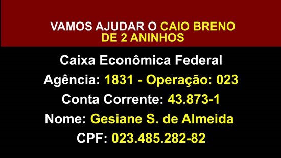 Nesta quinta-feira, 17/12, o Canal 35.1 (Bronca da Pesada) estará levando ao ar, a partir das 11 horas, um matéria completa relatando as dificuldades que a família vem enfrentando para custear as despesas com o garotinho Caio Breno de 2 aninhos. A mãe Geisiane irá relatar todo problema enfrentado por Caio, após ter sofrido várias paradas cardiorrespiratórias por cerca de 27 minutos, sendo desenganado pelas sequelas causadas. Vamos ajudar! Ligue: 3535-5686 ou 98463-8291. Endereço do Caio: Rua Macaé (5° Rua), 5208, Setor 09 de Baixo. Assista o vídeo: