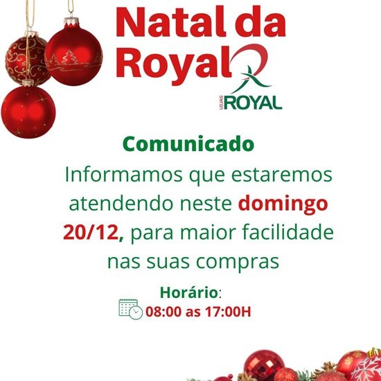 É isso mesmo! As Lojas Royal estarão abertas neste domingo, 20/12, das 08 às 17 horas, para garantir o presente de Natal de toda sua família! Você encontra nas Lojas Royal calçados, confecções, cama, mesa e banho, tecidos, malas, acessórios e bolsas. Corra para Royal e aproveite! Lojas Royal, localizadas na Alameda Piquiá e Alameda do Ipê - Centro. UMA SEMPRE PERTO DE VOCÊ!