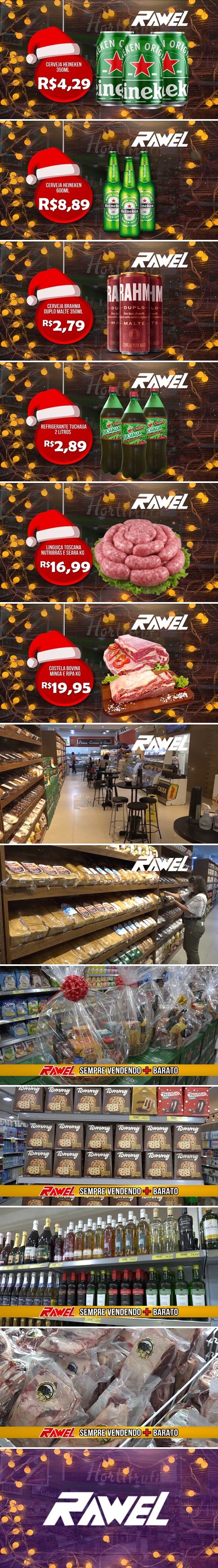O fim de ano está chegando, e o Rawel lhe oferece lindas cestas natalinas, de vários tamanhos e variedades, para você presentear a sua família e amigos. Contamos com uma nova lanchonete e padaria, mais ampla e aconchegante para atender você cliente. Você também vai encontrar no Rawel, panetone, bebidas, carnes e frutas. Confira as promoções desta segunda, 21/12 e terça, 22/12 no Rawel :