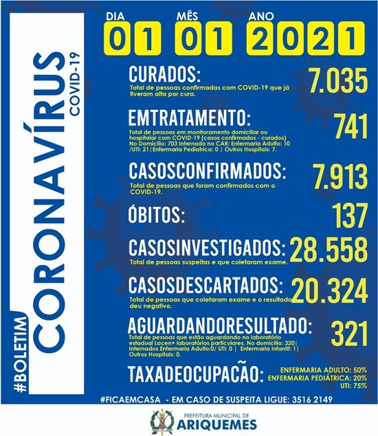 Nesta sexta-feira (1°), foram registradas 20 altas médicas, com relação ao boletim do dia anterior, chegando a 7.035 pessoas curadas, o que equivale a 88,90% do total dos casos.