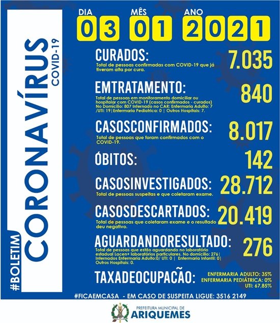Dentre os 840 casos ativos, 33 estão internados, sendo 7 na enfermaria adulto e 19 na UTI do Centro de Afecções Respiratórias (CAR), e 7 em outros hospitais. Os outros 807 estão em isolamento domiciliar.