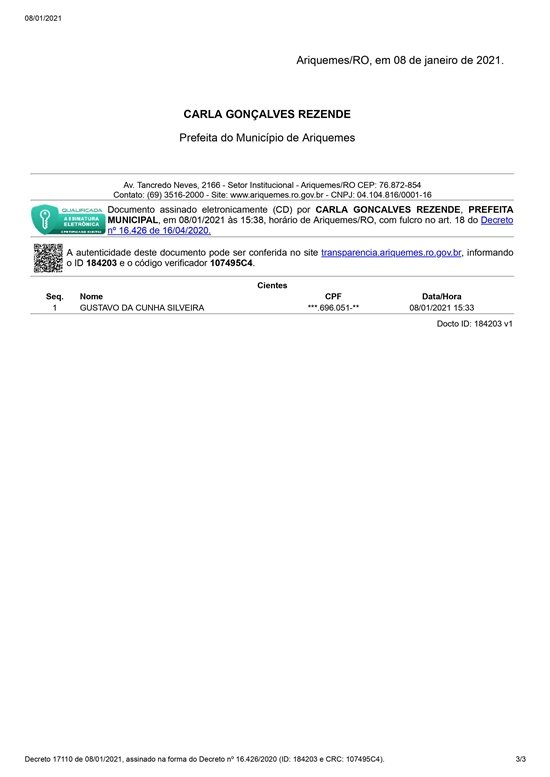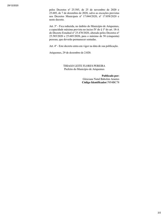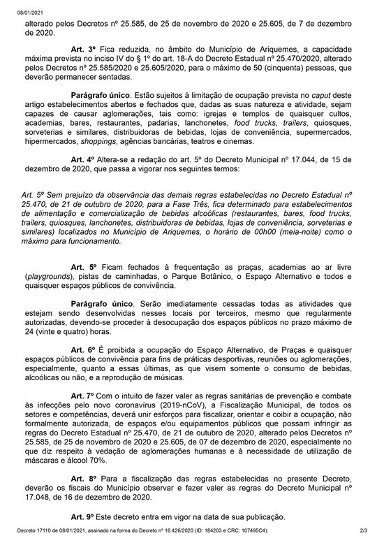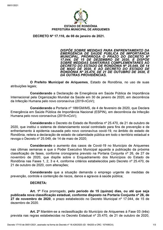 A Prefeitura de Ariquemes publicou nesta terça-feira (29), o Decreto Municipal n° 17.068/2020, para prorrogar por mais 10 (dez) dias a permanência do município na Fase 3, com base no Decreto Estadual 25.470/2020, publicado no dia 07/12/2020 e a Portaria Conjunta n° 26, publicada em 27 de novembro 2020, do Governo Estadual, referentes ao Sistema de Distanciamento Social Controlado para fins de prevenção e de enfrentamento à epidemia do novo coronavírus. O novo texto mantém a alteração efetuada pelo Decreto Municipal n° 17.058/2020, que estendeu o horário de funcionamento para os estabelecimentos de alimentação para até as 00h30. A Classificação na Fase 3 também pode ser alterada, caso o Governo do Estado publique nova classificação, por meio de Portaria Conjunta.